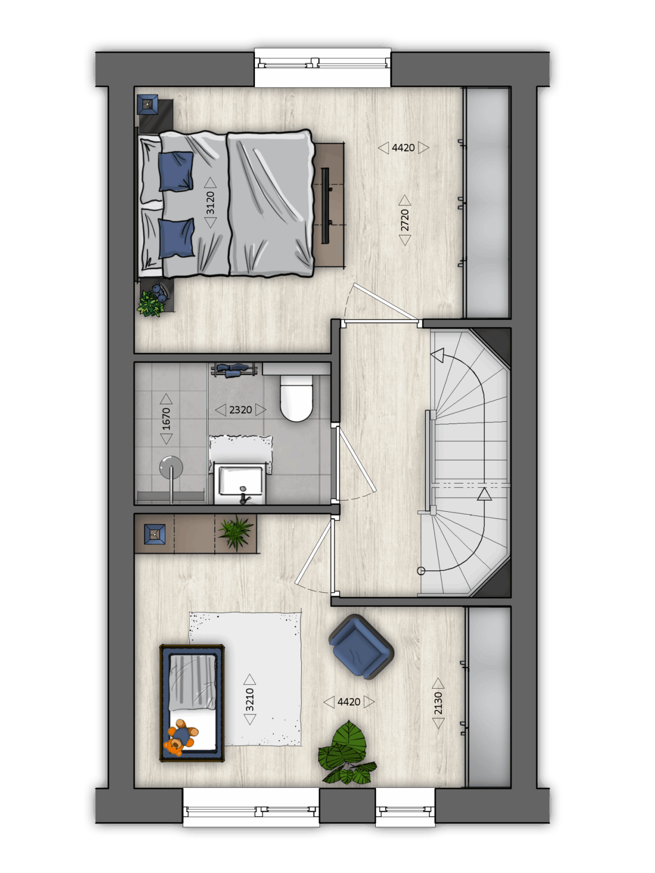 De eerste verdieping biedt standaard ruimte aan twee ruime slaapkamers, eventueel uit te breiden met een derde slaapkamer. Uiteraard is er een ruime badkamer. De badkamer is in de basis al voorzien van een inloopdouche, een toilet en een wastafel. In alle ruimtes geniet je van fijn daglicht dankzij voldoende ramen.