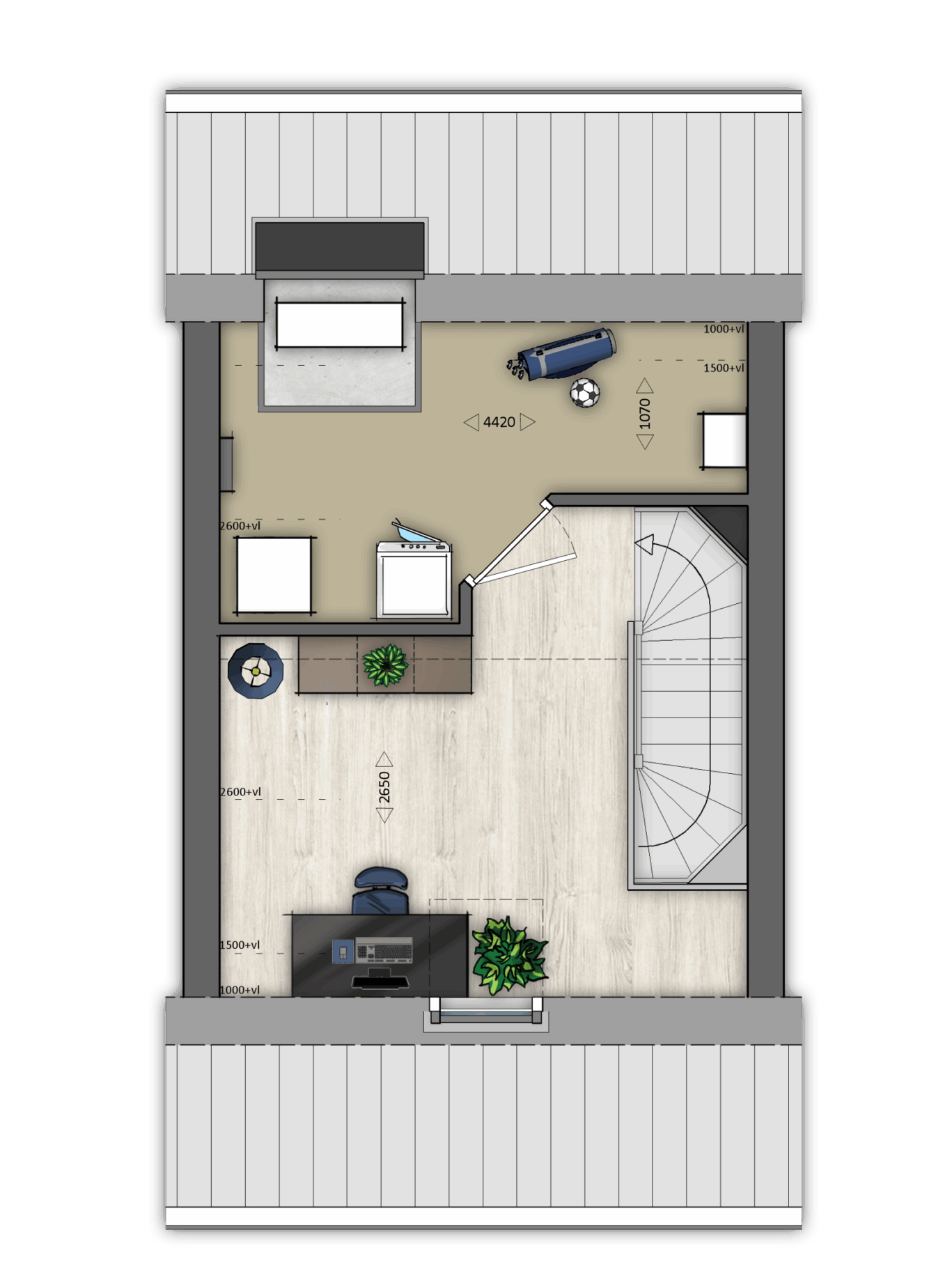 Via een vaste (open) trap bereik je de zolder. Deze grote (open) ruimte is naar wens te gebruiken, bijvoorbeeld als extra bergruimte en als werk-, sport- of speelruimte. Op deze verdieping tref je de opstelplaats voor de wasmachine (en eventueel droger). Ook zijn hier de technische installaties opgesteld, die je woning super comfortabel, duurzaam en energiezuinig maken. Ook het ‘buitendeel’ van de luchtwarmtepomp is ingenieus geplaatst in de technische ruimte, makkelijk voor het onderhoud en mooi weggewerkt in de woning.